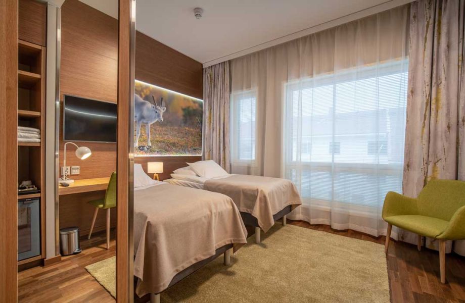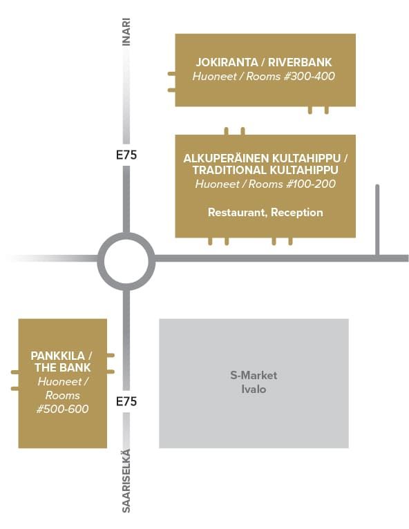Hotel Kultahippu is located in the center of Ivalo, close to all services and easy transport connections, including the nearby airport. Our accommodation consists of three buildings: the renovated main building, the modern Riverbank extension, and the cozy Bank building.